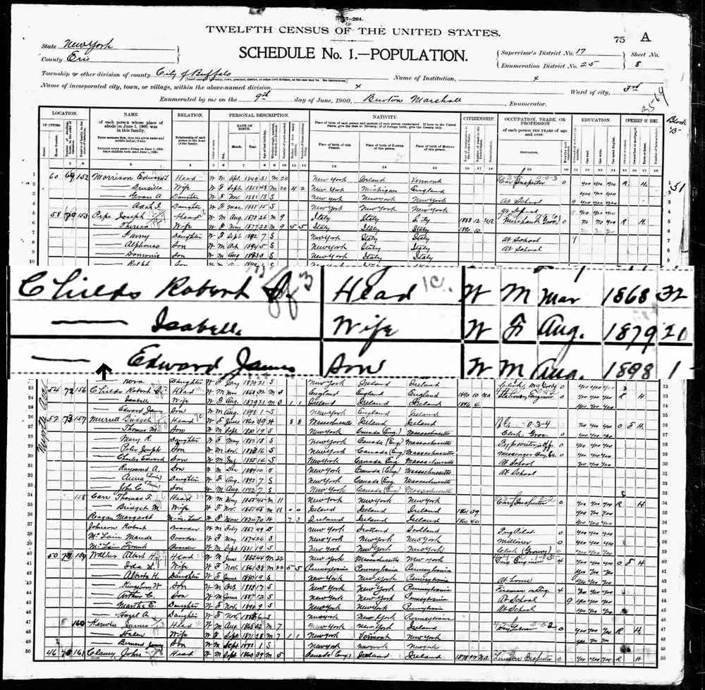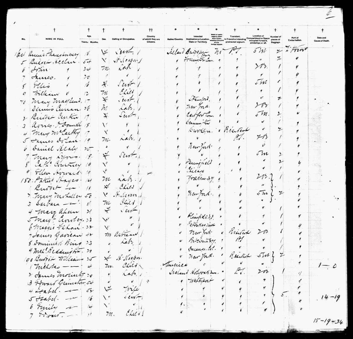 Raised in Ireland. 1/4 Scottish 3/4 English. Lived in a hut with a dirt floor. Family on one side; cows on the other. She had very poor eyesight and was shunned by the kids in her Protestant School in Ireland. Her father sent her to a Catholic Convent School. She was given her first pair of glasses by the nuns at the school. Came to the U.S. with her father, mother, sister Emily and brother Edward on the SS Britannic arriving 3 weeks before her 17th birthday, July 17, 1896 from Queenstown, Ireland (now Cobh, since 1920) to New York City. The passsenger list says their destination is Waterport, NY. Census of 1900 says she was living in Erie County, Buffalo NY with her husband, Robert Childs and first son James Edward. She was born on the Isle of Wight or Isle of Man and was raised in Southern Ireland. Images The SS Britanic Britannic passenger list (bottom five of the list) (big file)